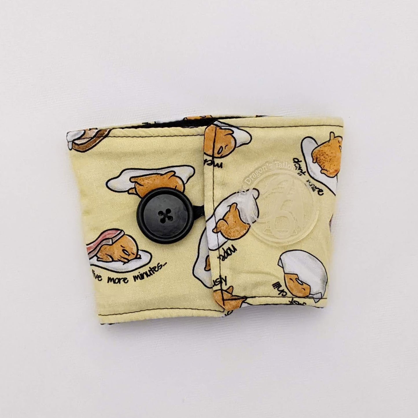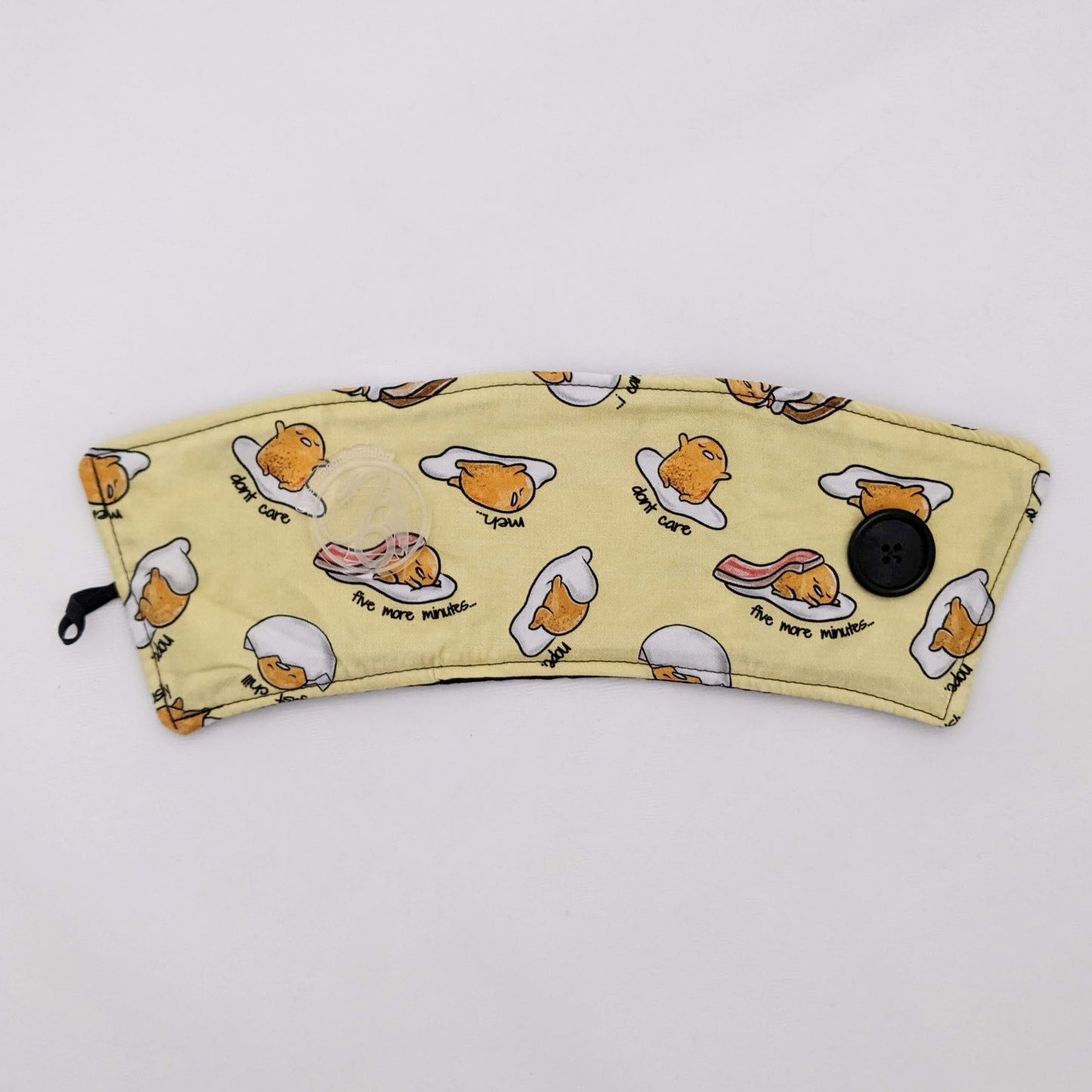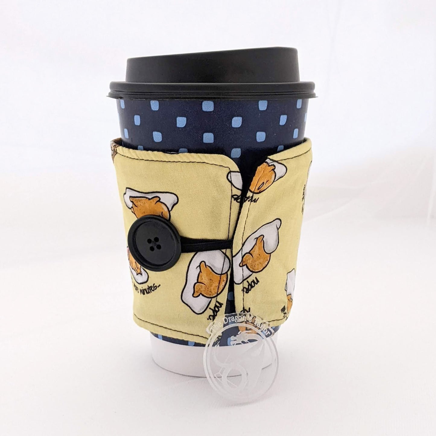 Protect your hands from a too-warm coffee cup (or from a too-cold and wet iced drink!) and insulate your beverage at the same time with this adorable coffee sleeve! It's extra-wide and has a button and elastic loop closure, so it's comfortable for any size hand and will fit around even the large cups. Featuring a very sleepy egg on toast.