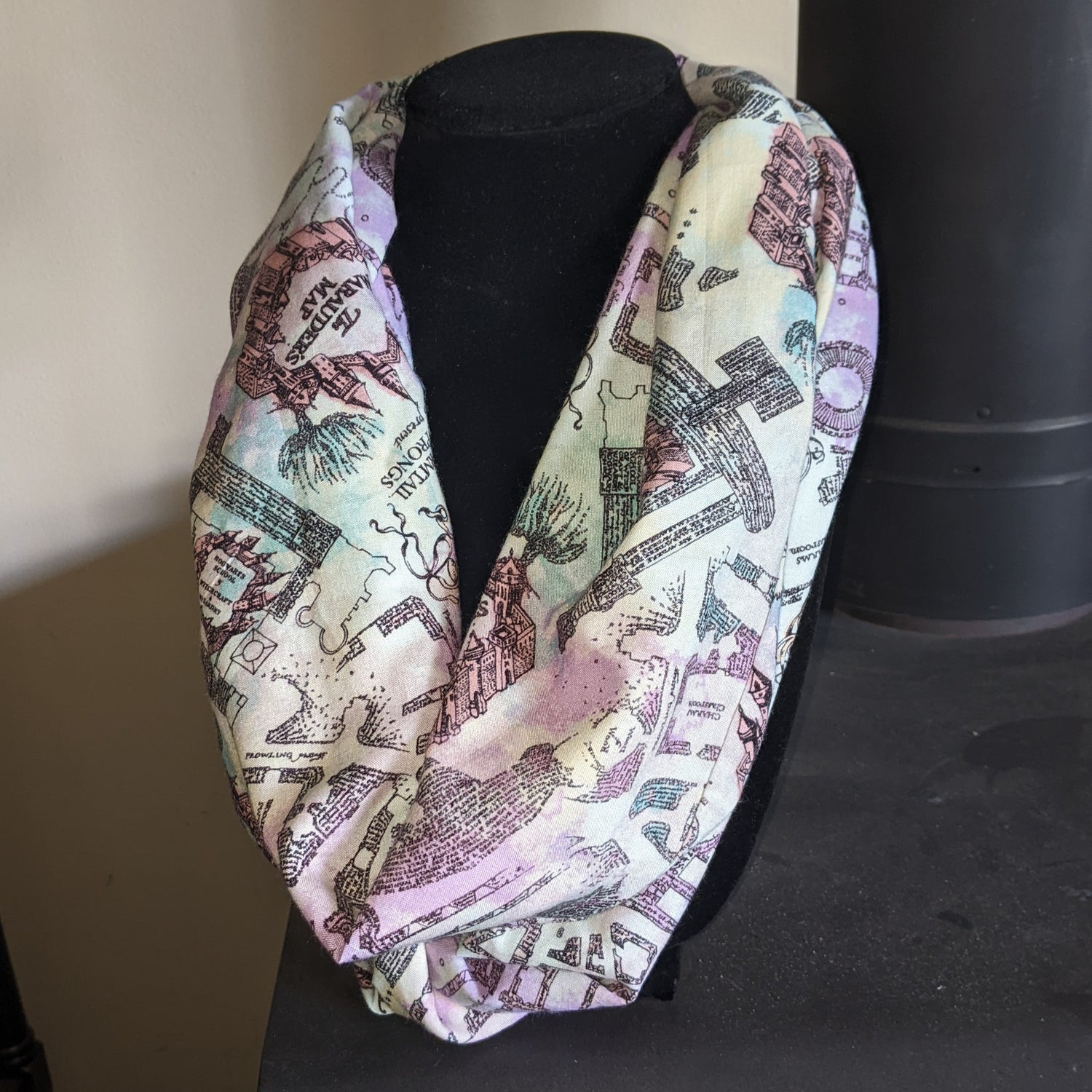 Stay warm AND fashionably geeky in cool weather with this pretty infinity scarf that doubles as a map to your magic school!